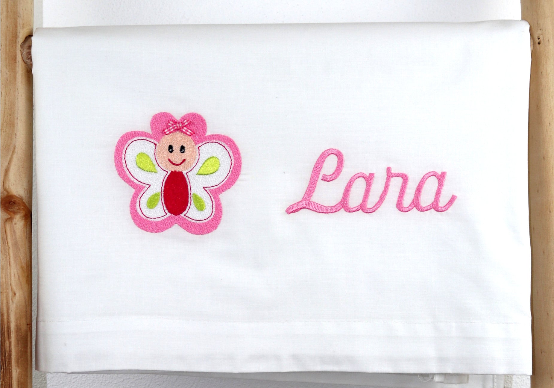 Lençol de cima para cama de bebé/cama de grades, com o desenho e o nome bordados na barra. Oferta de fronha lisa.
